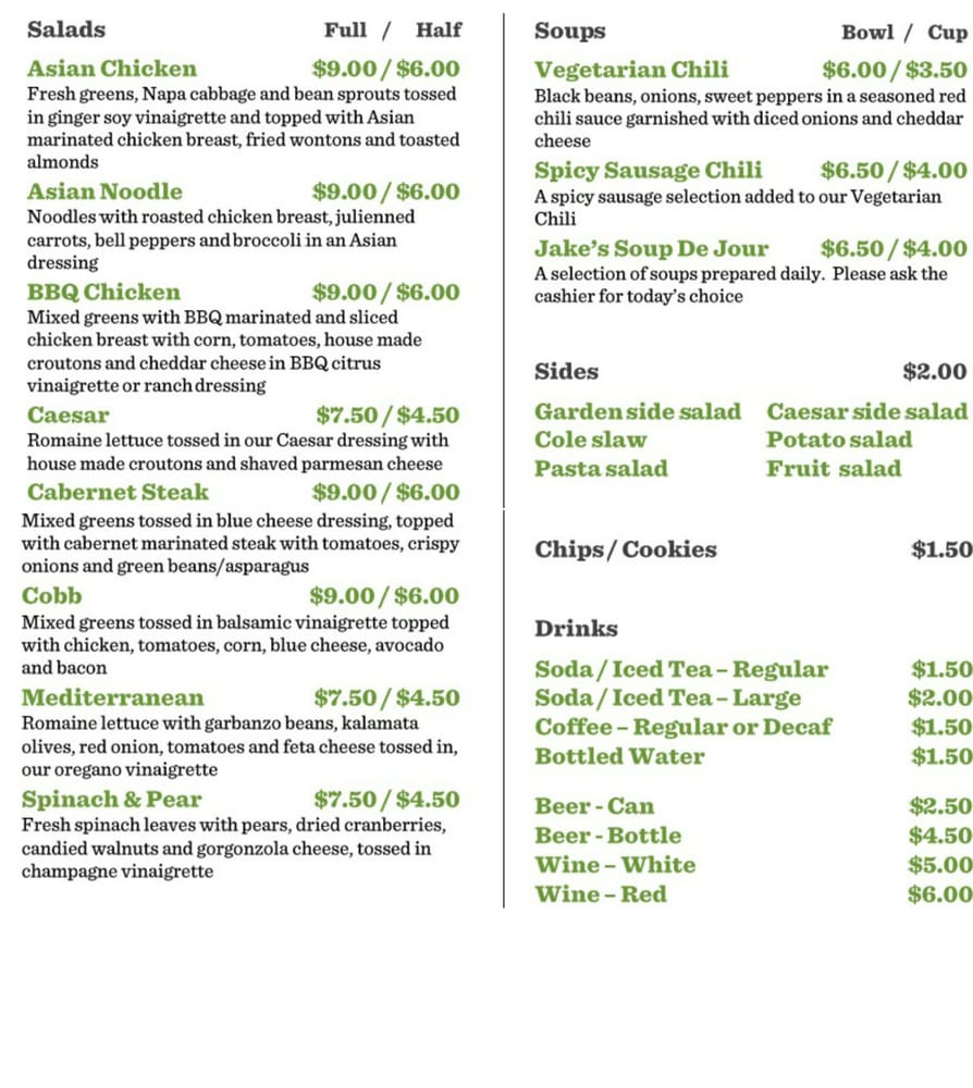 Introducing the menu of Jake’s Cafe & Catering, a charming eatery located in Livermore, CA, where flavor meets comfort. Known for its delicious sandwiches and salads, this cafe is a local favorite for casual dining experiences. From the tantalizing Asian Chicken Salad with ginger soy vinaigrette to the hearty Meat Lovers Omelet, there's something for everyone.